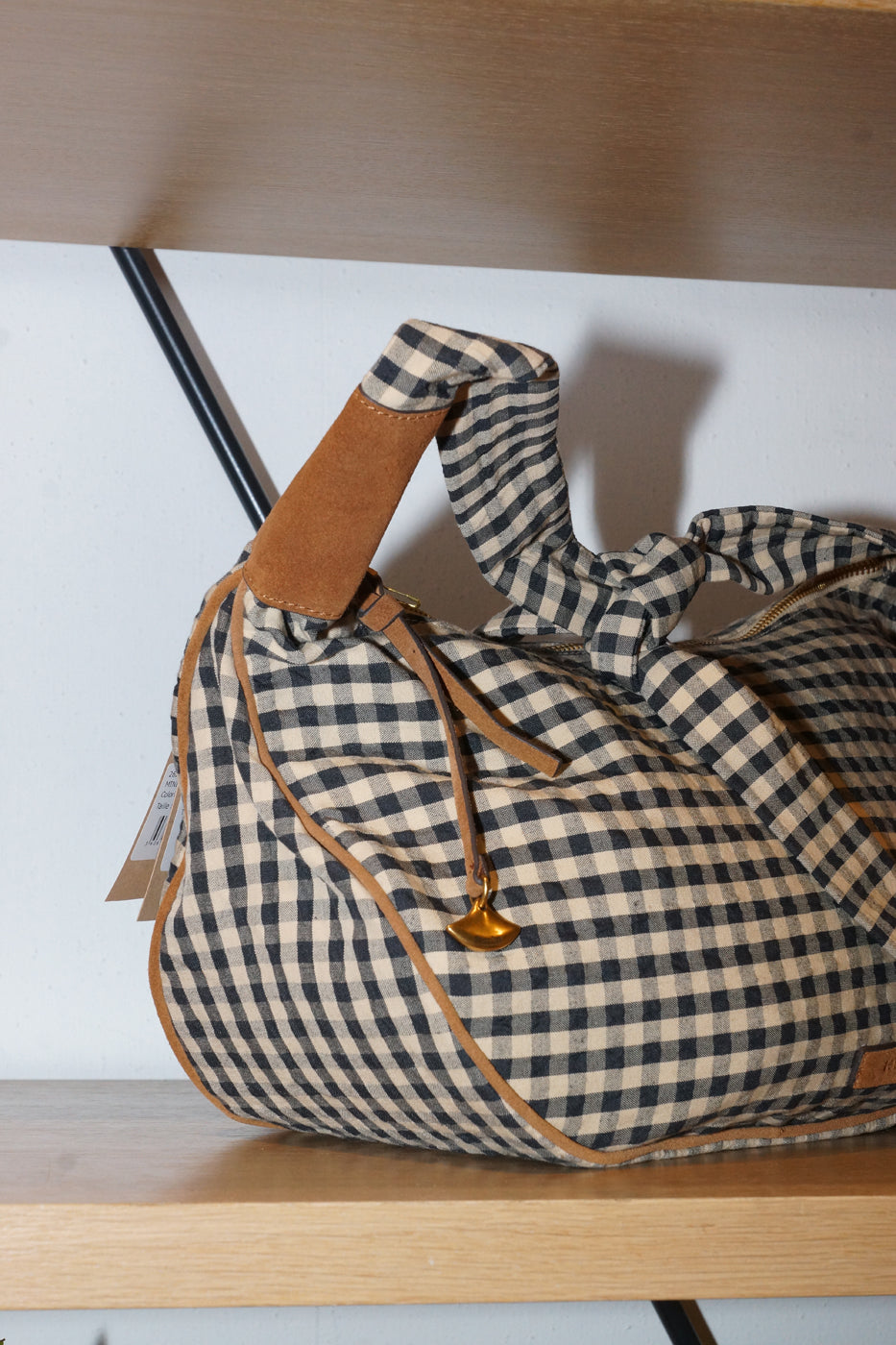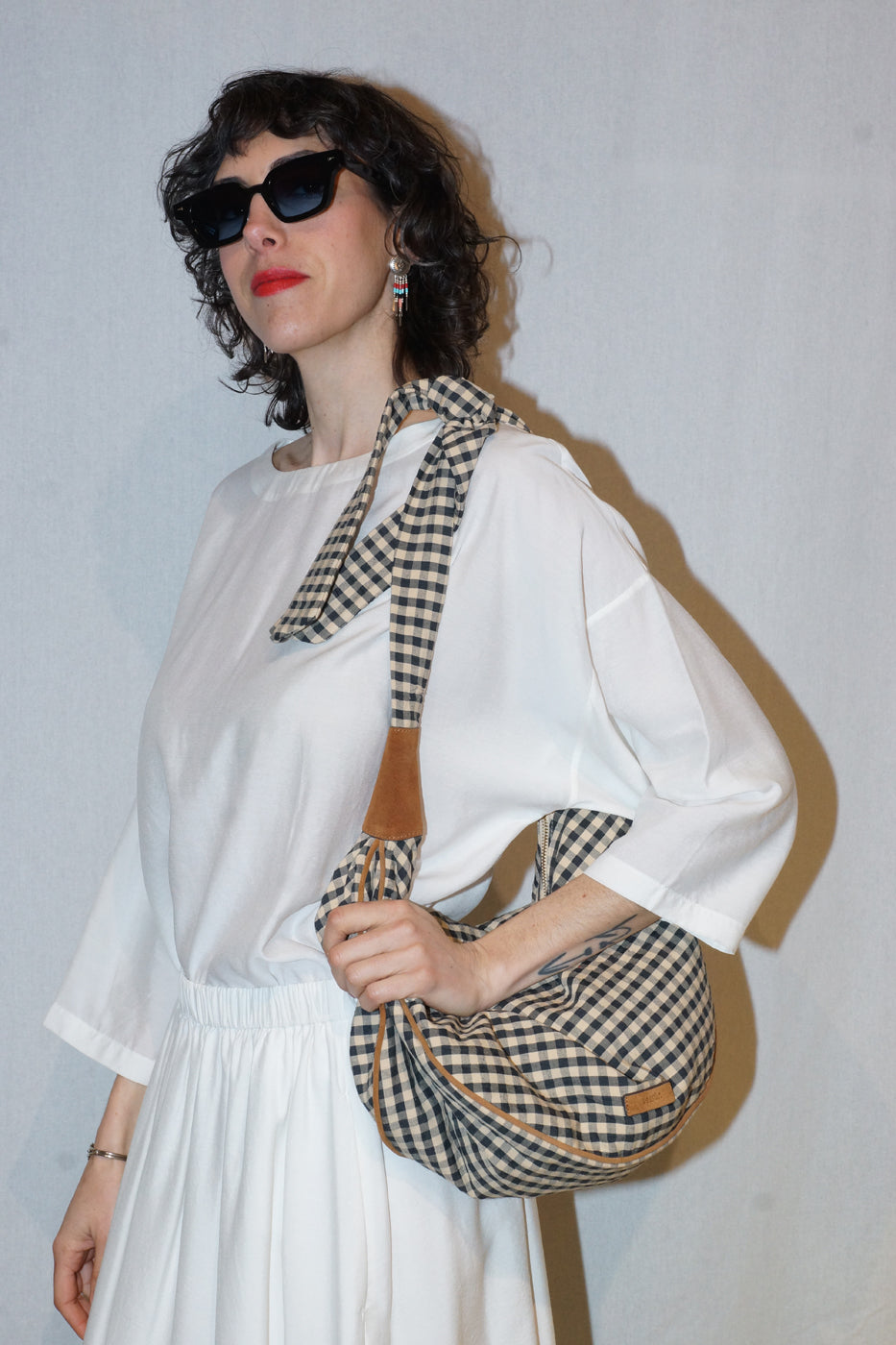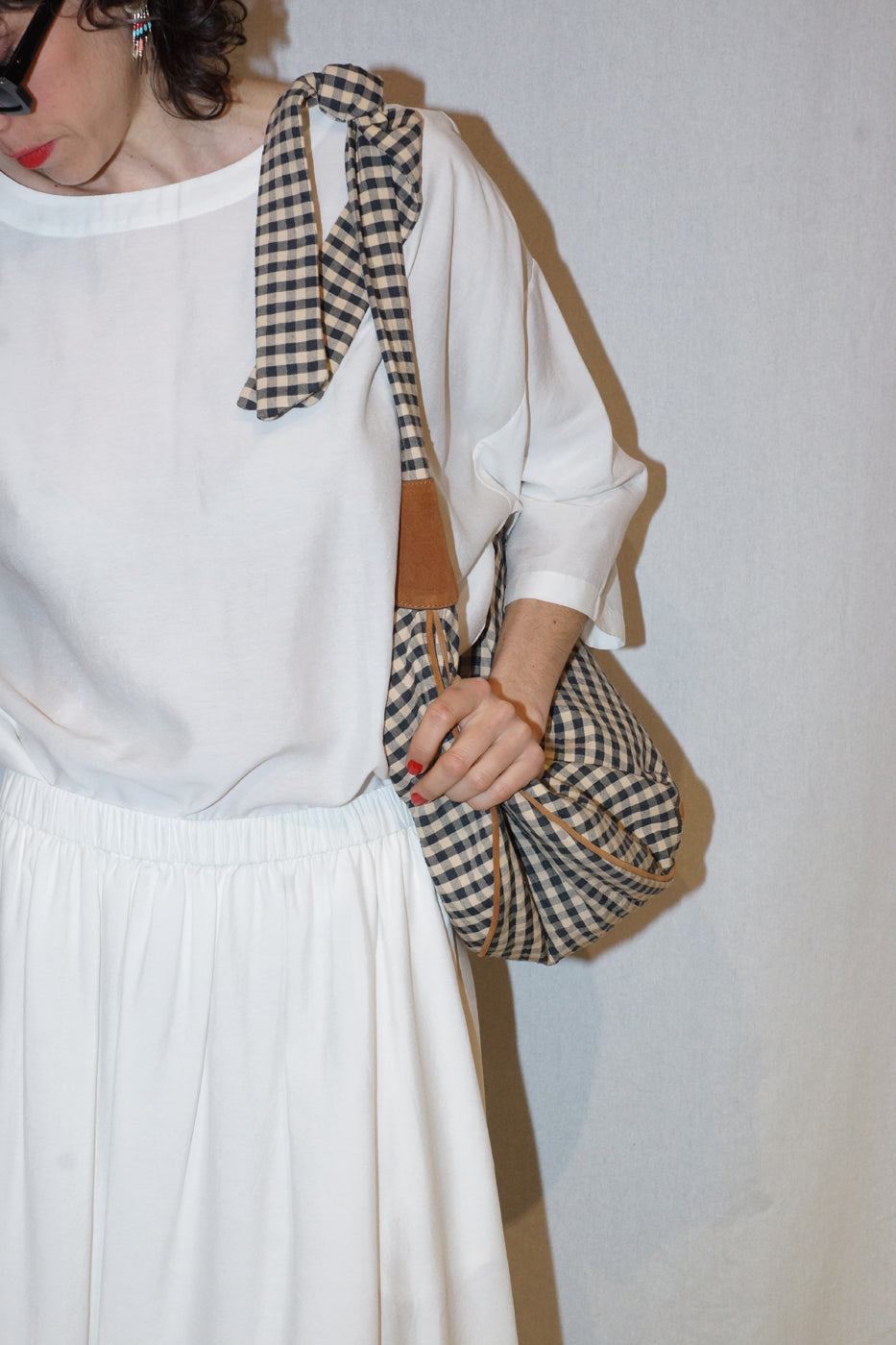 Sac MINILANGO Sessun souple hobo en coton à carreaux vichy avec empiècements en cuir suédé de vache. Anse souple à nouer pour un porté croisé ou épaule. Fermeture zippée.