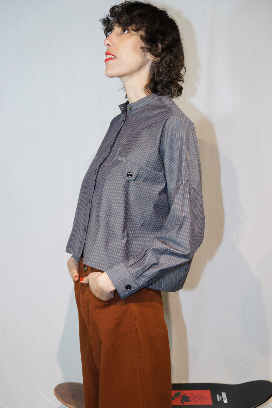 Chemise ORREGIA SESSÙN courte à poches passepoilées en popeline compacte de coton à rayures contrastées, tissée en Italie. Col rond, fermeture boutonnée dont un bouton bijou au pied de col, emmanchures basses